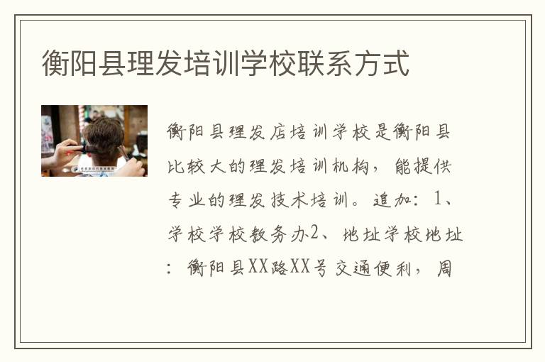 衡阳县理发店培训学校是衡阳县比较大的理发培训机构,能提供专业的理发技术培训。追加:1、学校学校教务办2、地址学校地址:衡阳县XX路XX号交通便利,周边有多条公交线路,更方便学员到校。3、网站咨询学校官方网站:学校网站···