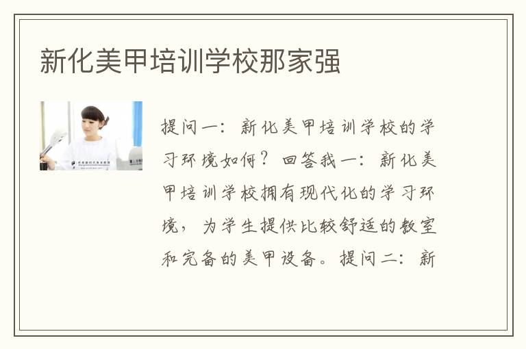 提问一:新化美甲培训学校的学习环境如何?回答我一:新化美甲培训学校拥有现代化的学习环境,为学生提供比较舒适的教室和完备的美甲设备。提问二:新化美甲培训学校的师资力量如何?回答我二:新化美甲培训学校占据···
