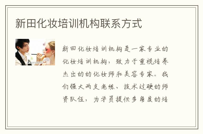 新田化妆培训机构是一家专业的化妆培训机构,致力于重视培养杰出的的化妆师和美容专家。我们强大两支老练、技术过硬的师资队伍,为学员提供多角度的培训课程和实践机会。不论你是初学者应该有当然基础的化妆师,我们都能代你量身设计专属坐骑的培训方案。要是你对化妆行业饱含···